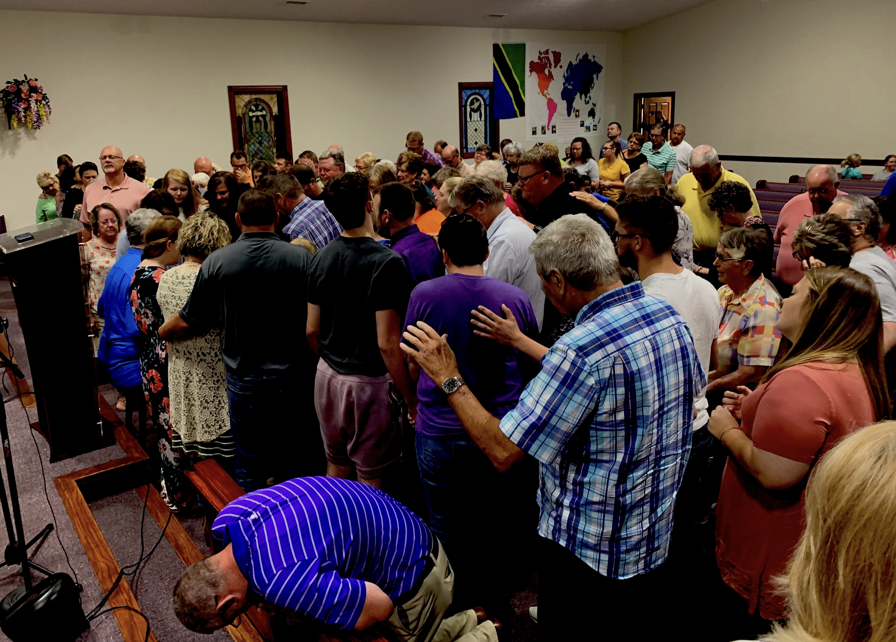 We always gather close to one another, never leaving people spread out across a room or separated by seats. Everyone is invited to gather around the altar at the front of the sanctuary or auditorium. The altar represents a place of sacrifice: a place of “laying down one’s life.” Often this reminder is spoken aloud while people are coming forward.